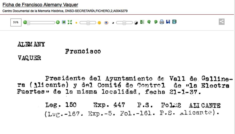 Casa de les Puces. C/Carreró, núm. 4. Casa de las hijas de Francisco Alemany Vaquer “Pusa” (Benirrama, 1895), de 56 años, casado y padre de tres hijas: Rosita, Paquita y Vicentica. Alcalde republicano de la Vall de Gallinera, fue detenido y encarcelado el 09/05/1939, y condenado por un consejo de guerra el 19/06/1941 a 20 años por “Auxilio a la rebelión”. Fue puesto en libertad vigilada el 02/02/1956. Las hijas del alcalde republicano también sufrieron represión. Para evitarla, se escondieron en la actual casa rural de Frederic Alemany y Alemany, junto al restaurante Ta Casa, antiguo Hostal de Benissivà, del abuelo de Frederic Alemany. Después emigraron a los Estados Unidos.